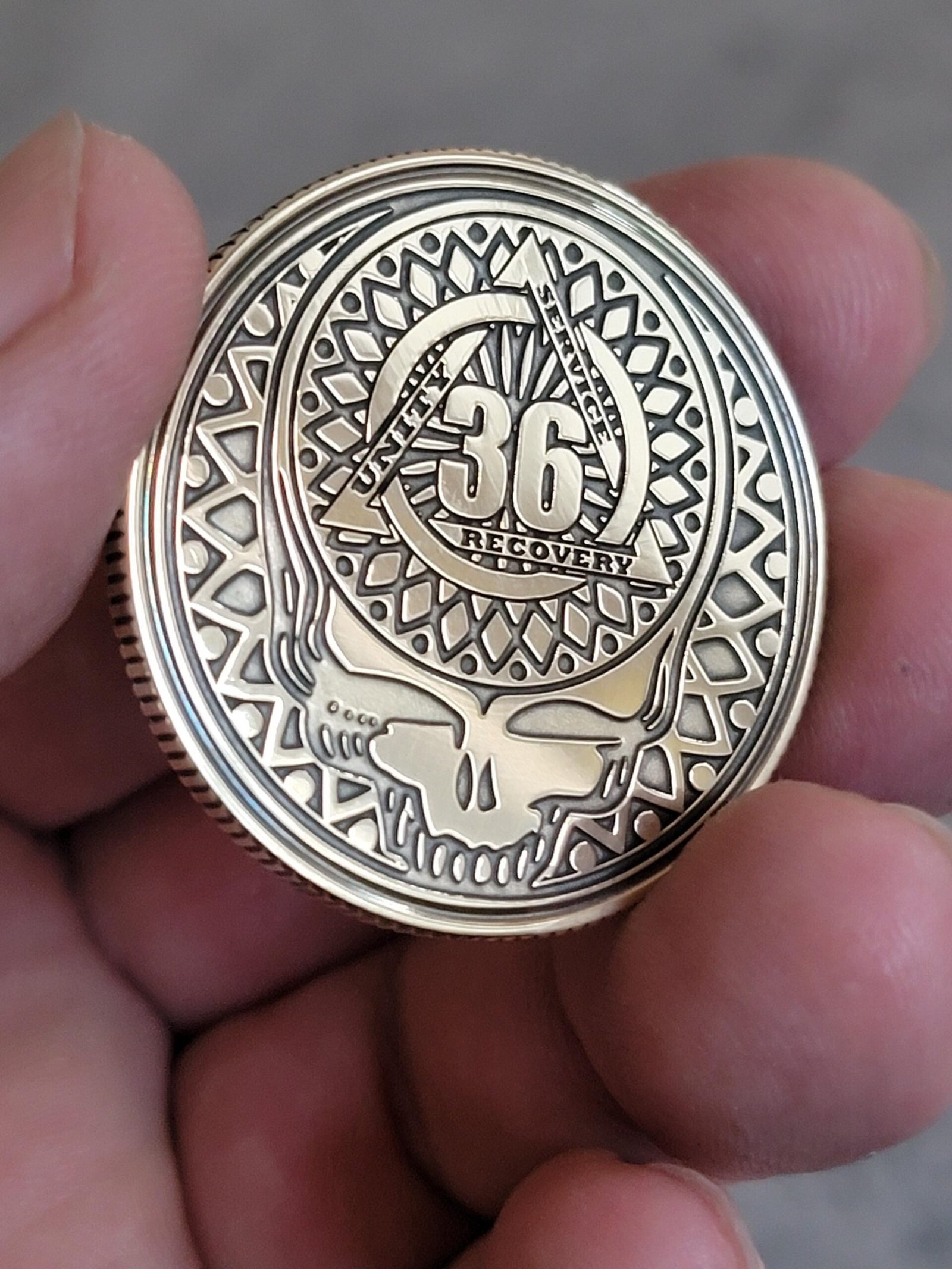 NA Stealie recovery anniversary coin with years on front and NA symbol on the back.