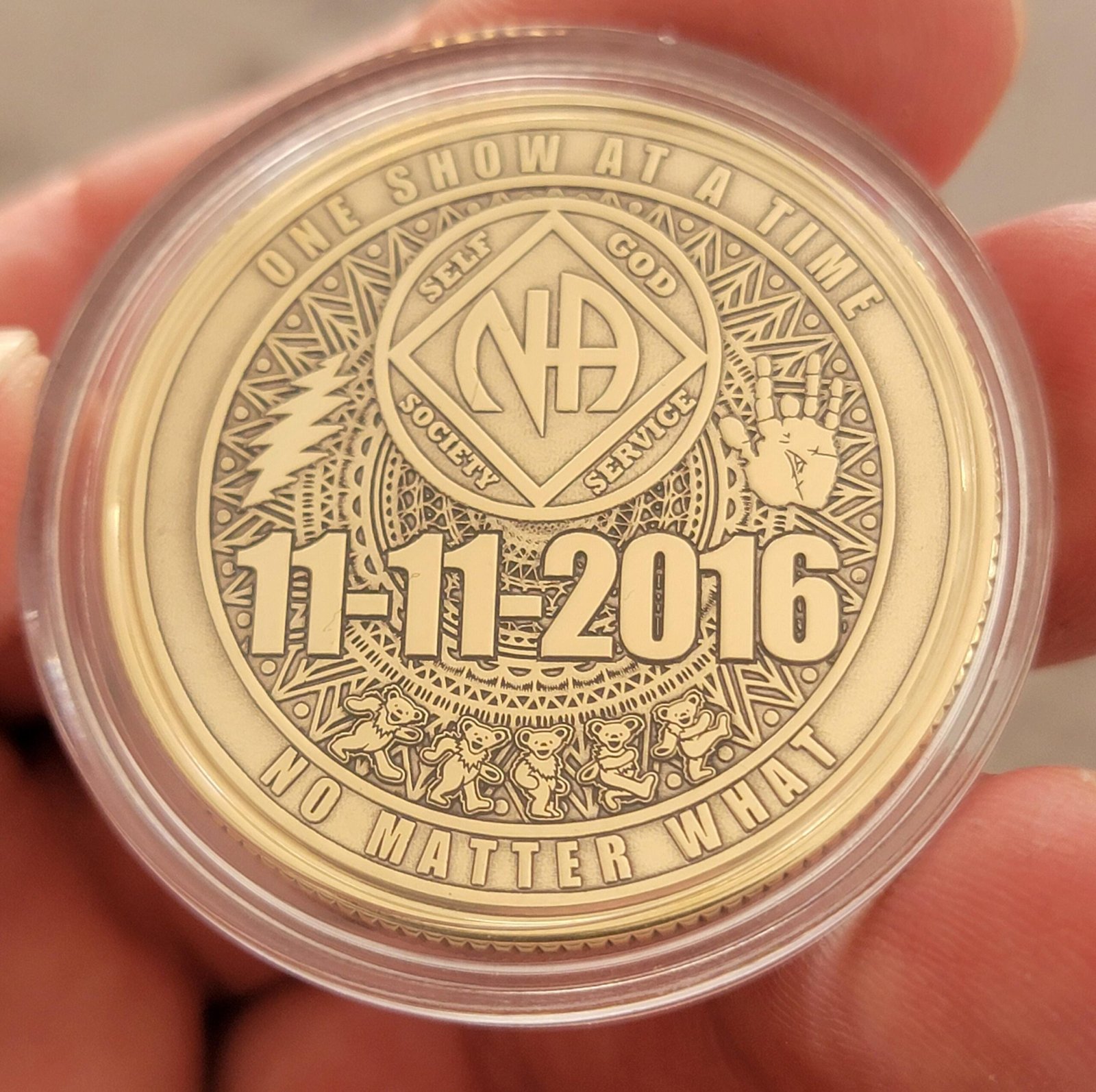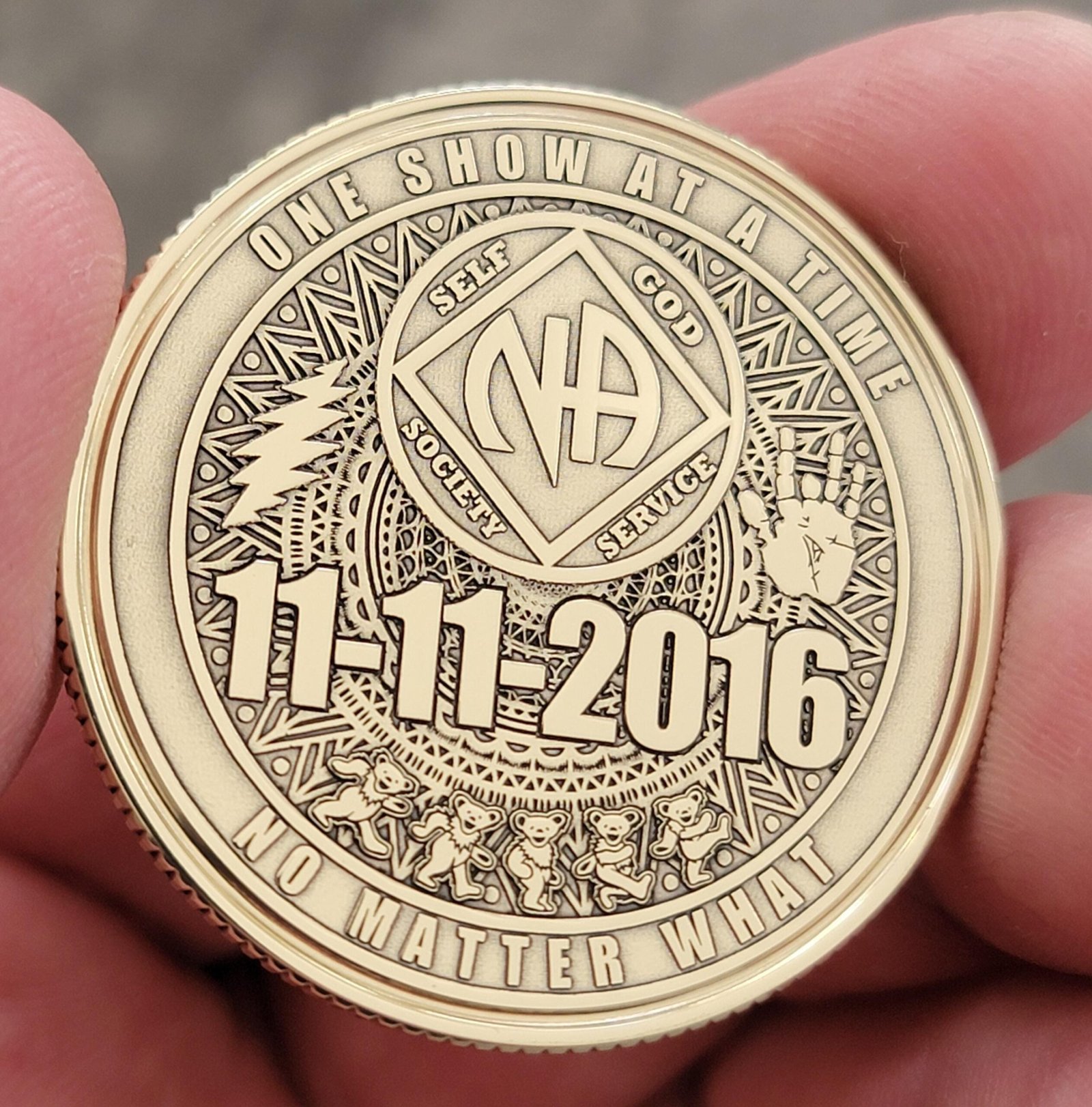 NA Stealie recovery anniversary coin with years on front and NA symbol on the back.