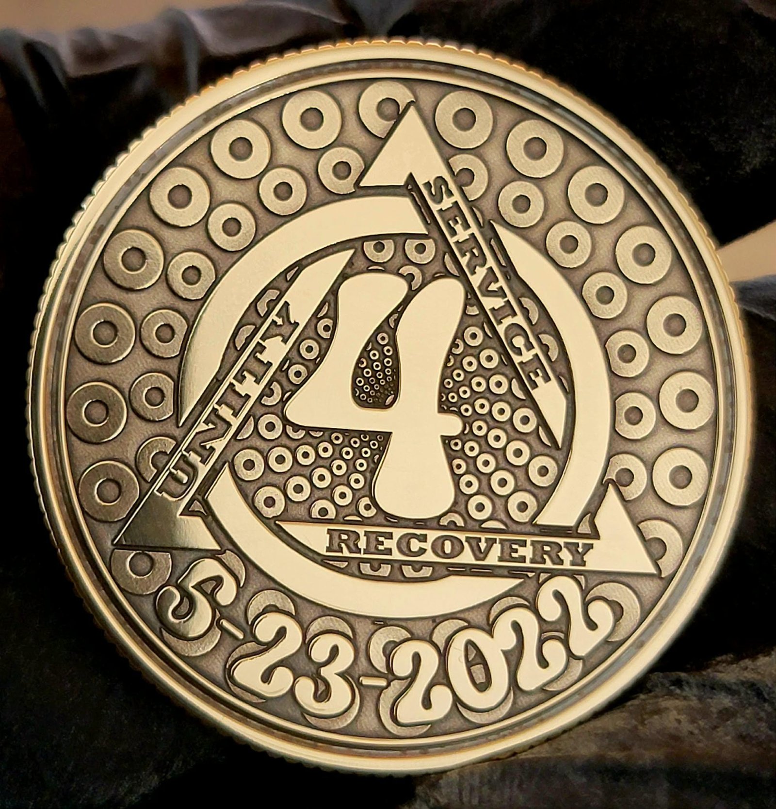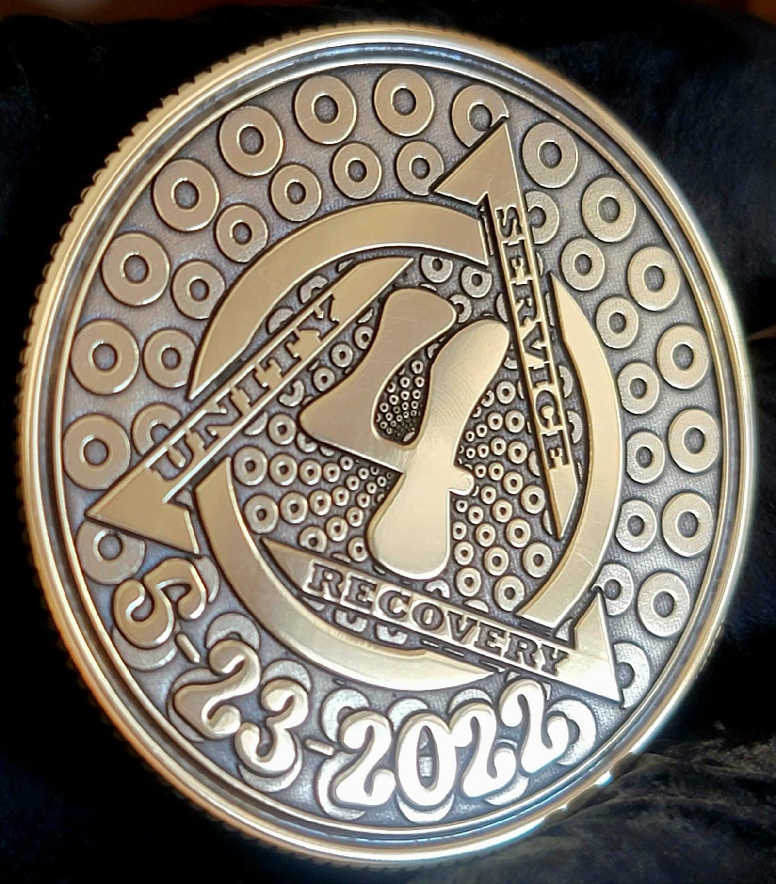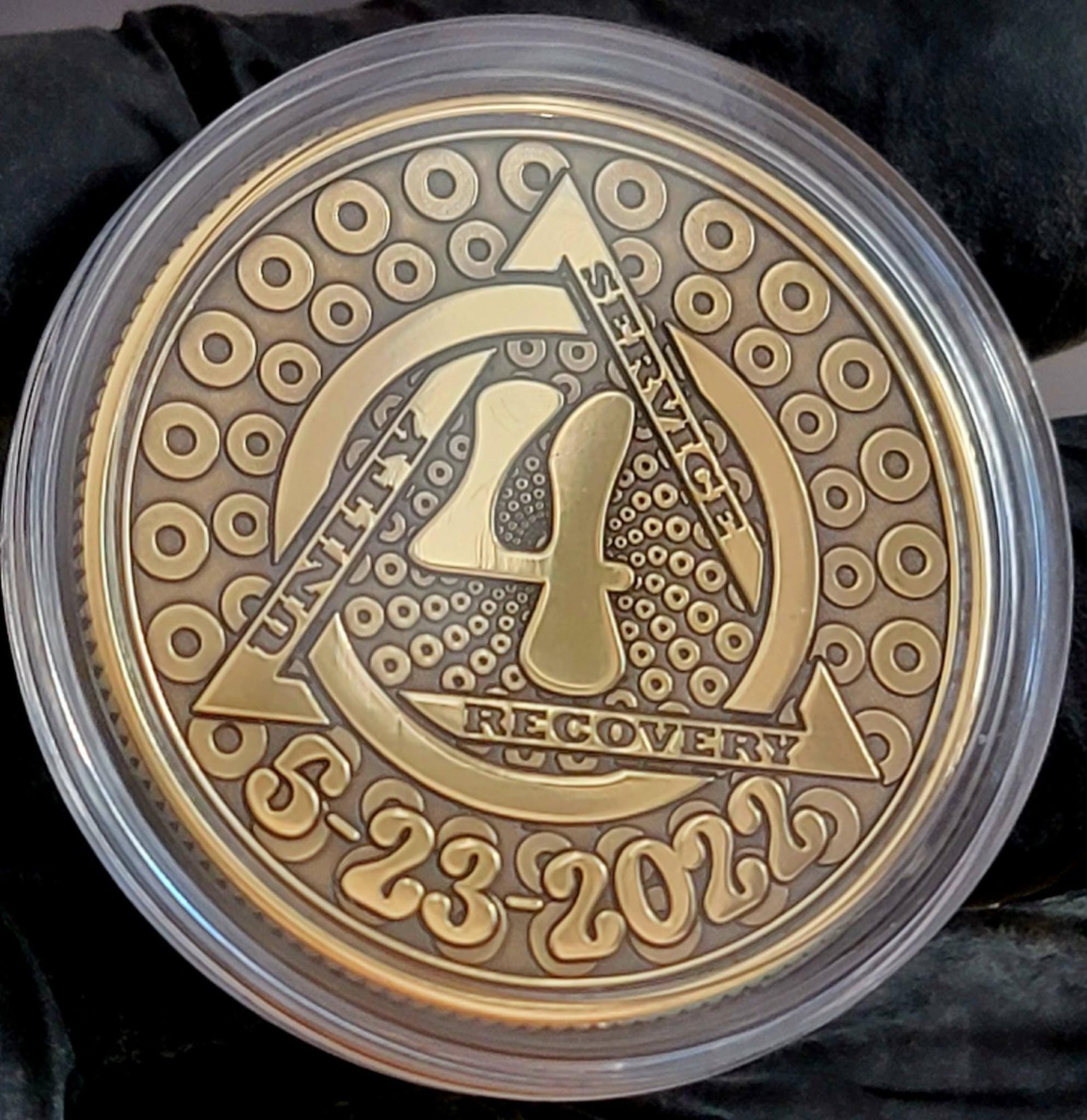 NA Stealie recovery anniversary coin with years on front and NA symbol on the back.