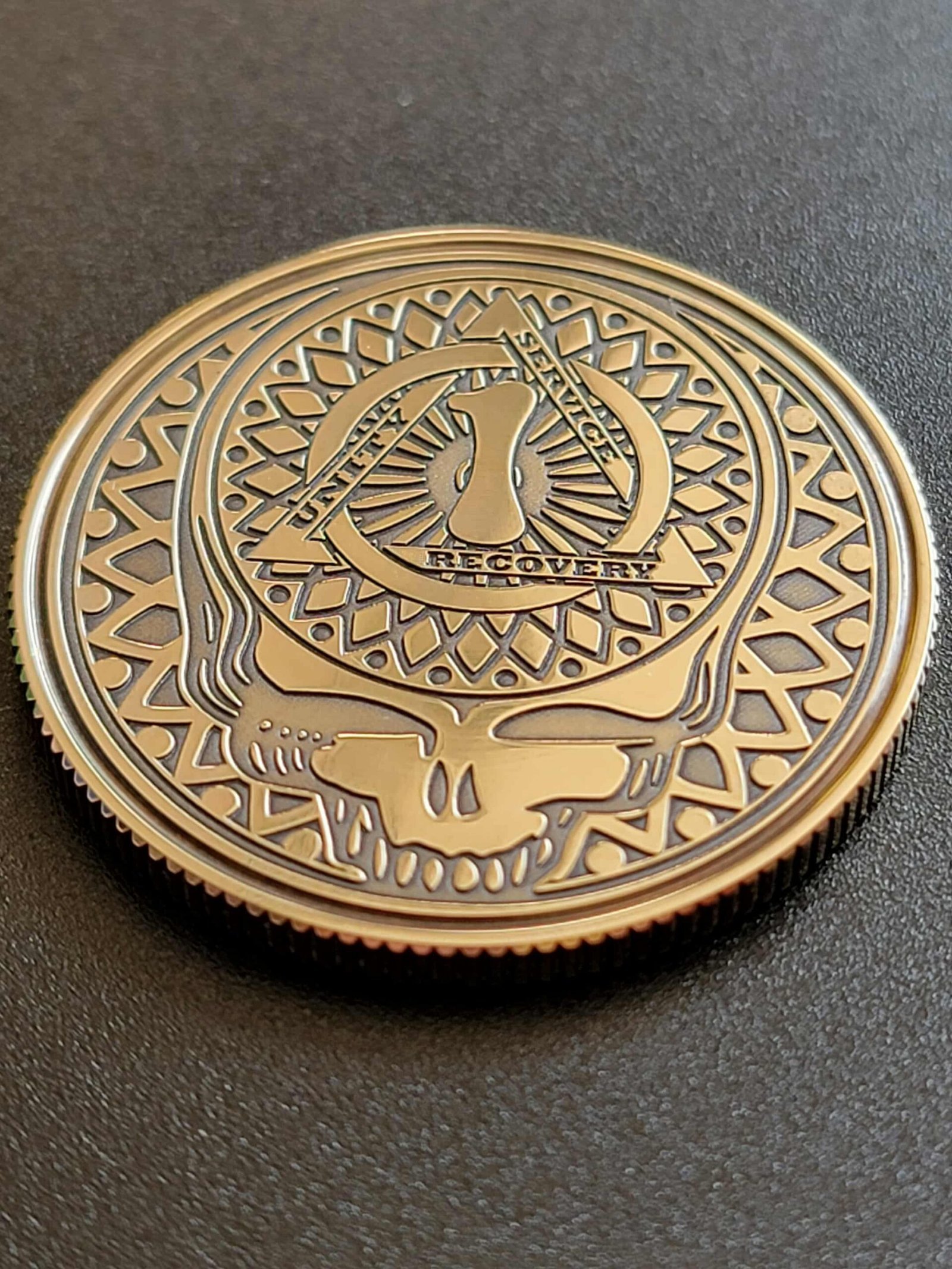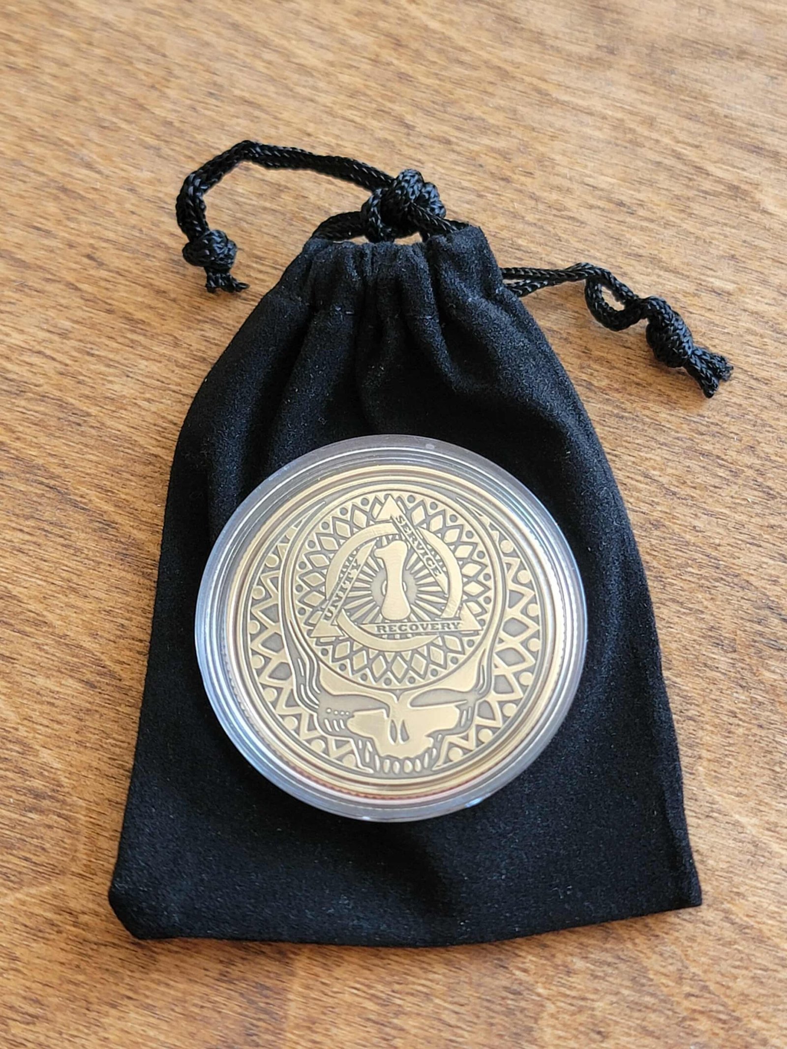 Made from solid 40mm brass and precision laser-engraved, one side features the classic recovery triangle (Unity, Service, Recovery) intertwined with a skull mandala backdrop personalized with the number of years clean. While the reverse side showcases the flying Wharf Rat and your personalized sobriety anniversary date.